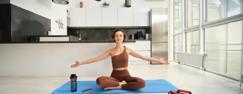 Wähle eine rutschfeste Matte, auf der du dich stabil fühlst. Räume zwei Armlängen Platz frei, stell das Handy auf lautlos, lüfte kurz und nutze warmes Licht. Ein kleines Ritual, etwa eine Kerze oder ein Duft, kann dir helfen, sofort im Körper anzukommen.